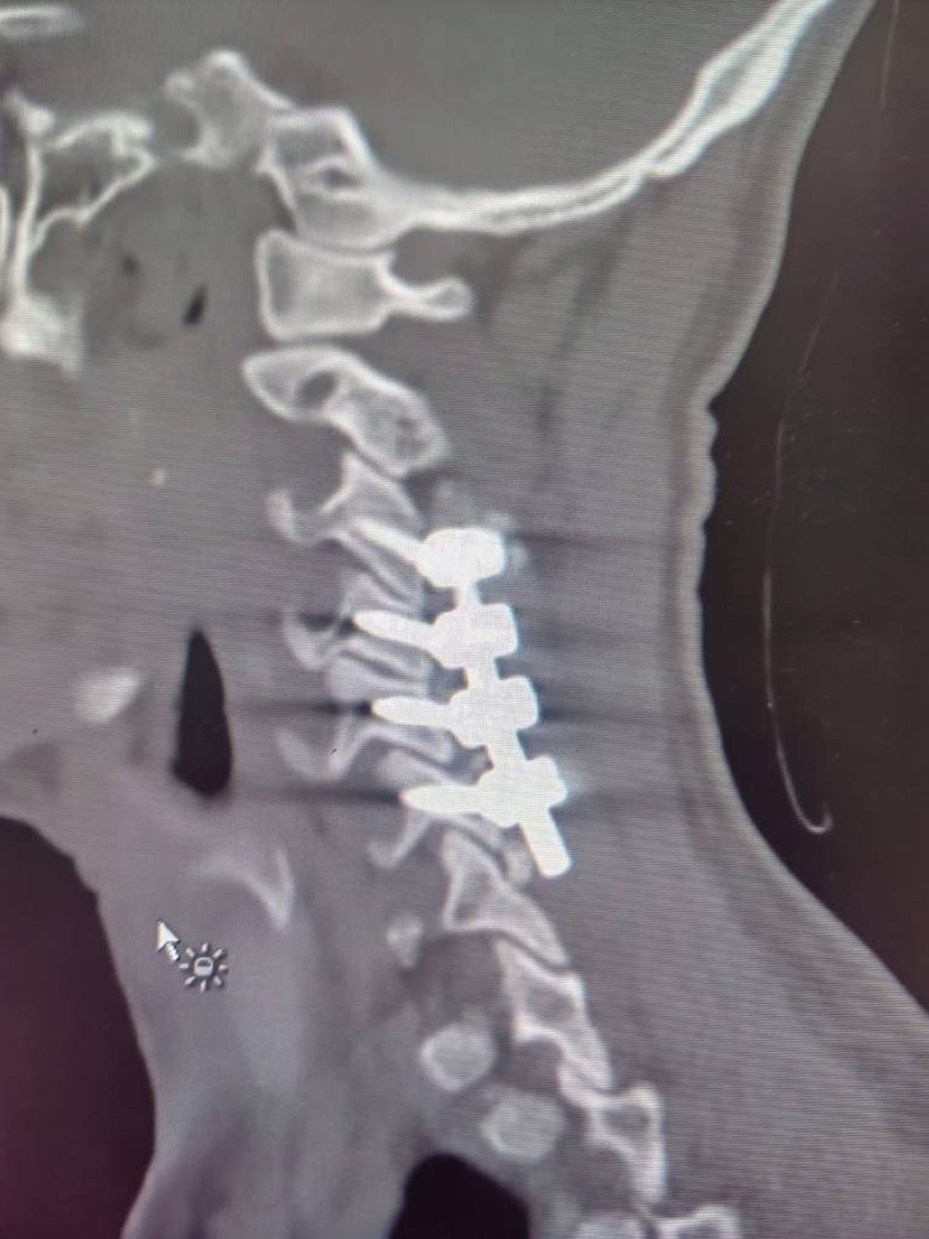 وكان المريض قد نُقل إلى قسم الطوارئ وهو يعاني من شلل تام في الأطراف السفلية وضعف ملحوظ في الأطراف العلوية، وكشفت الفحوصات الطبية والأشعة التصويرية عن وجود كسور متعددة في الفقرات العنقية الرابعة والخامسة والسادسة من الجهتين الأمامية والخلفية، مع اقتراب خطير من الشريان الفقري، أحد الشرايين الرئيسية المغذية للدماغ، كما أظهرت النتائج وجود كدمة شديدة ونزيف في الحبل الشوكي عند مستوى الفقرات الثالثة والرابعة والخامسة، ما تطلّب تدخلاً فوريًا لتفادي مضاعفات تهدد حياة المريض.