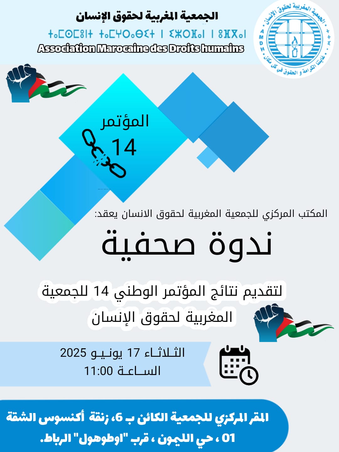 في أعقاب انعقاد المؤتمر الوطني الرابع عشر للجمعية المغربية لحقوق الإنسان يوم الأحد 15 يونيو 2025، يُنظّم المكتب المركزي الجديد ندوةً صحفية يوم الثلاثاء 17 يونيو 2025، على الساعة الحادية عشرة صباحًا، بالمقر المركزي للجمعية بشارع الحسن الثاني، زنقة أكنسوس، العمارة 6، قرب “أوطوهال” بمدينة الرباط.