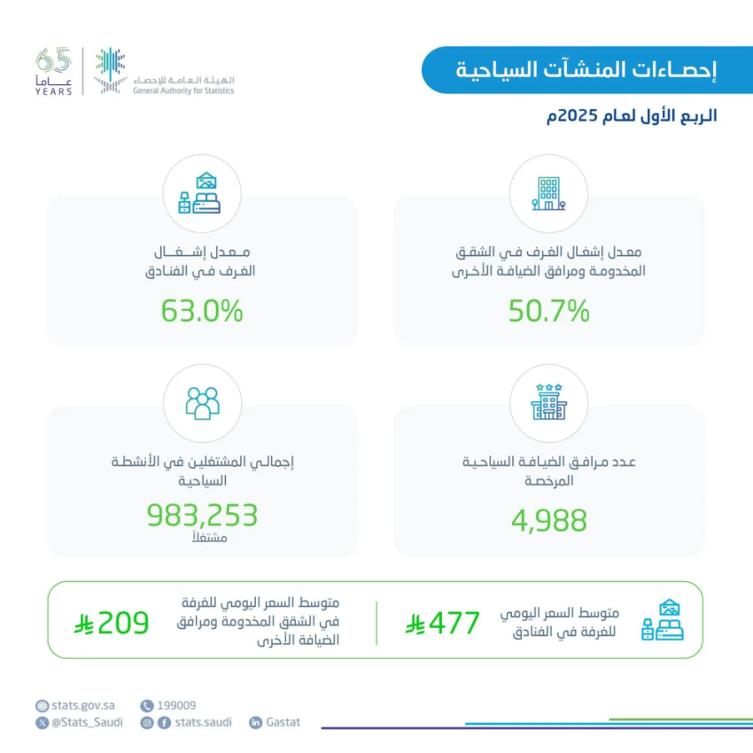 وبحسب النشرة فقد ارتفع إجمالي عدد المشتغلين في الأنشطة السياحية خلال هذا الربع عن الربع المماثل من (2024م) ليبلغ (983,253) مشتغلًا بنسبة ارتفاع بلغت (4.1%)، فيما بلغ عدد المشتغلين السعوديين (243,369) مشتغلًا، بنسبة مشاركة قدرها (24.8%) من الإجمالي, بينما بلغ عدد المشتغلين غير السعوديين (739,884) مشتغلًا بنسبة مشاركة قدرها (75.2%) من إجمالي المشتغلين في الأنشطة السياحية.