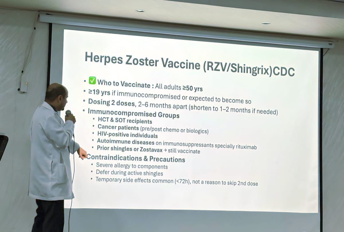 وشملت المحاضرات ثلاثة محاور رئيسية، بدأها د. فاضل الحداد، استشاري الأمراض المعدية، بعرض طبي تناول أعراض الحزام الناري ومضاعفاته وطرق الوقاية، مؤكدًا أهمية التدخل المبكر باللقاح.