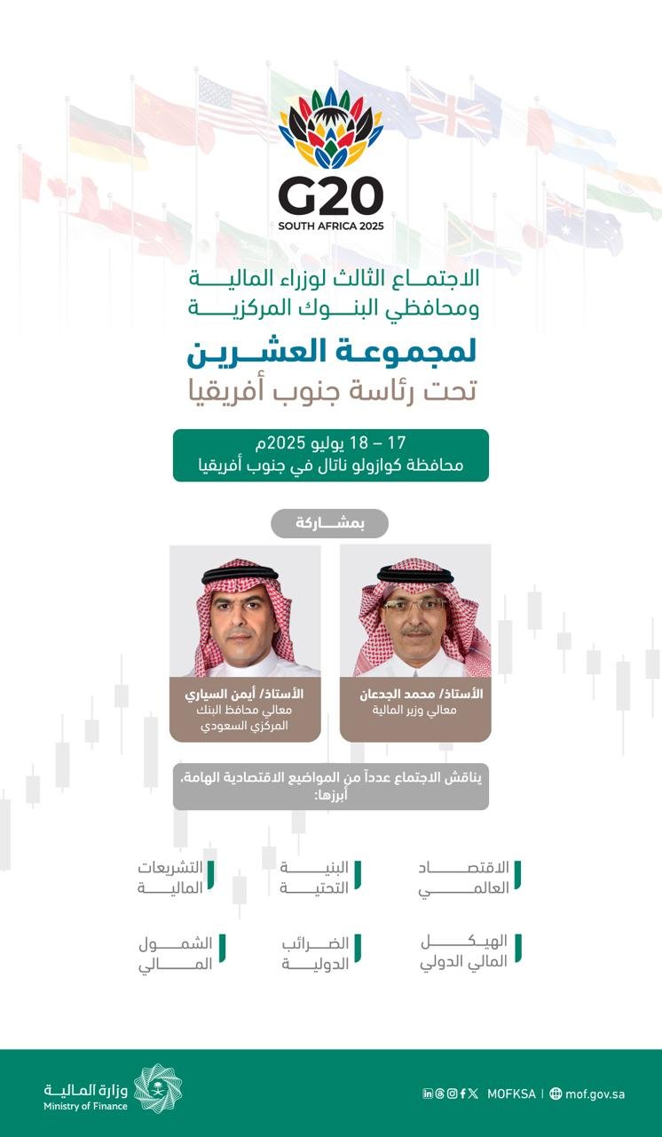 يترأس معالي وزير المالية الأستاذ محمد بن عبدالله الجدعان، وفد المملكة المشارك في الاجتماع الثالث لوزراء المالية ومحافظي البنوك المركزية لمجموعة العشرين تحت رئاسة جنوب أفريقيا، الذي سيقام خلال الفترة 22 – 23محرم 1447هـ الموافق 17 – 18 يوليو 2025م، في محافظة كوازولو ناتال فيجنوب أفريقيا، بحضور ومشاركة وزراء المالية ومحافظي البنوك المركزية من دول المجموعة، وعدد من ممثلي الدول المدعوة، ورؤساء المنظمات المالية الدولية والإقليمية.
