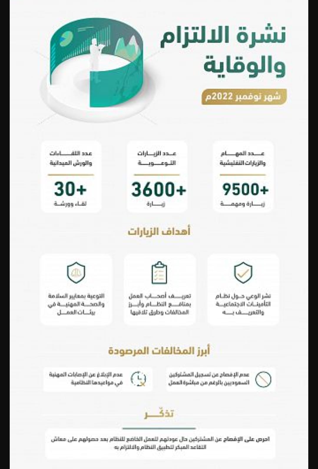 أعلنت المؤسسة العامة للتأمينات الاجتماعية عن قيامها وعبر فرق الالتزام التأميني والرقابة بأكثر من 9500 زيارة للعملاء من أصحاب العمل والمنشآت خلال شهر نوفمبر 2022م.