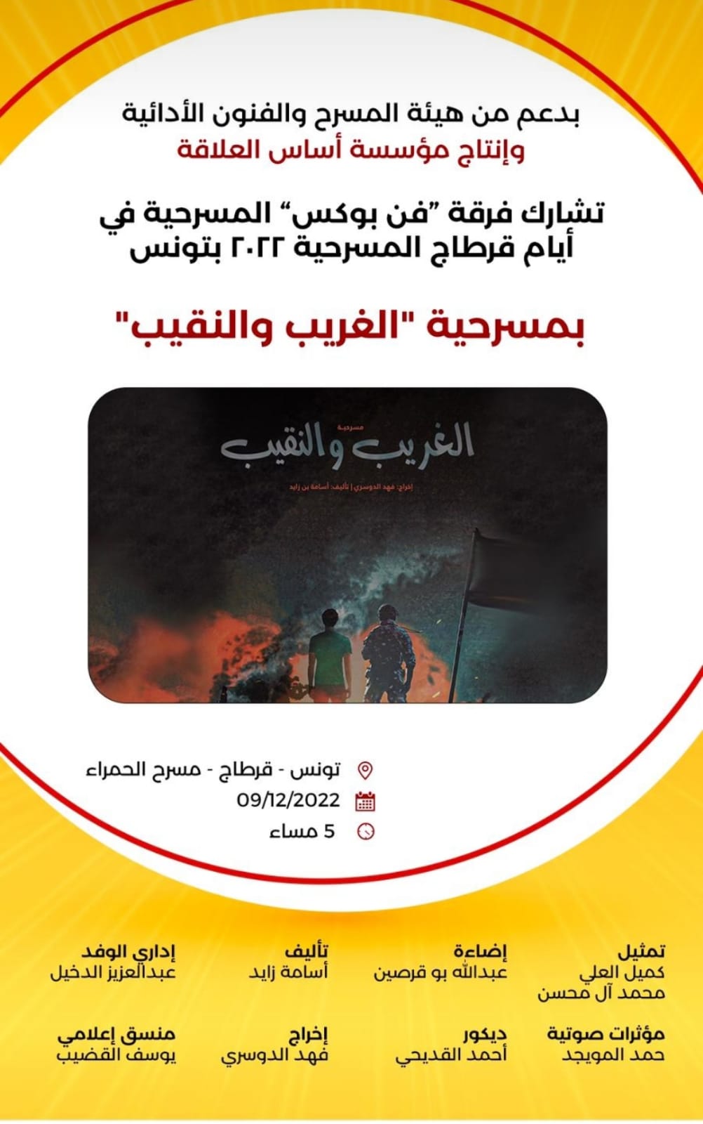 بدعم من هيئة المسرح والفنون الادائية تشارك مؤسسة أساس العلاقة بالعرض المسرحي ” الغريب والنقيب ” وذلك ضمن عروض المسار الموازي لـ أيام قرطاج المسرحية بتونس والتي تنطلق فعالياتها في 3 ديسمبر وتستمر حتى 10 ديسمبر الجاري 2022م