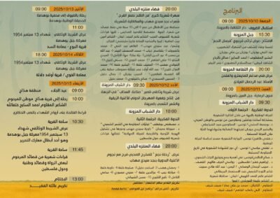 تخصص أيام الاثنين والثلاثاء (13 و 14 أكتوبر) لرحلات ثقافية للضيوف إلى محمية بوهدمة، وعروض وثائقية متكررة حول “شهداء 13 سبتمبر 1954 – معركة جبل بوهدمة”.