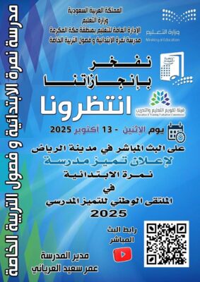 ومن المقرر أن تحتفي وزارة التعليم غدًا الإثنين بالمتميزين في حفل رسمي يقام في العاصمة الرياض، بحضور عدد من القيادات التعليمية والمسؤولين، حيث سيمثل مدرسة نمرة في هذا الملتقى مدير المدرسة الأستاذ عمر سعيد العرياني.