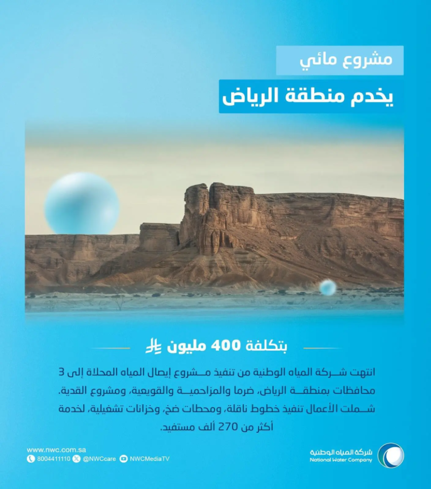 انتهت شركة المياه الوطنية، مُمَثلةً بقطاعها الأوسط من تنفيذ مشروع إيصال المياه المحلاة إلى (3) محافظات بمنطقة الرياض، شملت ضرما والمزاحمية والقويعية، إضافة إلى مشروع القدية غرب مدينة الرياض، وذلك ضمن جهودها المتواصلة، وبدعمٍ من وزارة البيئة والمياه والزراعة، لتنفيذ خططها الإستراتيجية لتهيئة البنى التحتية في كُلٍ من قطاعيّ المياه والخدمات البيئية، بتكلفةٍ بلغت نحو (400) مليون ريال.
