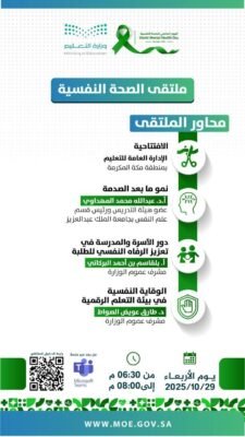 ويأتي هذا الملتقى ضمن جهود وزارة التعليم المستمرة لرفع الوعي النفسي، ودعم بيئة تعليمية صحية وآمنة تُسهم في تحسين الأداء النفسي والتعليمي للطلبة.