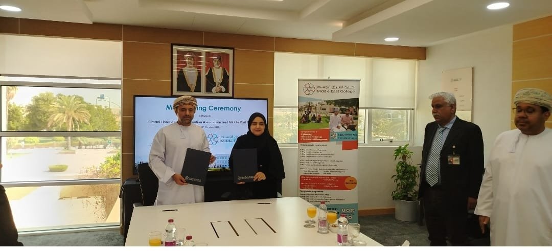 في إطار تعزيز الشراكة بين مؤسسات التعليم العالي والجمعيات المهنية المتخصصة، وقّعت الجمعية العُمانية للمكتبات والمعلومات اتفاقية تعاون مشتركة مع كلية الشرق الأوسط، وذلك في حفل أقيم صباح اليوم بمقر الكلية في واحة المعرفة – مسقط.