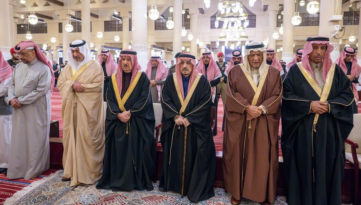 وأدى الصلاة مع سموه، صاحب السمو الملكي الأمير تركي بن فيصل بن عبدالعزيز، وصاحب السمو الأمير متعب بن ثنيان بن محمد، وصاحب السمو الملكي الأمير سطام بن سعود بن عبدالعزيز، وصاحب السمو الملكي الأمير الدكتور مشعل بن محمد بن سعود بن عبدالعزيز، وصاحب السمو الأمير سعود بن عبدالله بن ثنيان بن محمد، وصاحب السمو الأمير عبدالرحمن بن فهد بن فيصل بن فرحان، وصاحب السمو الملكي الأمير معتصم بن سعود بن عبدالعزيز، وصاحب السمو الملكي الأمير مصعب بن سعود بن عبدالعزيز، وصاحب السمو الملكي الأمير حسام بن سعود بن عبدالعزيز أمير منطقة الباحة، وصاحب السمو الأمير محمد بن سعد بن خالد بن محمد، وصاحب السمو الملكي الأمير مشعل بن بدر بن سعود بن عبدالعزيز، وصاحب السمو الملكي الأمير الوليد بن بدر بن سعود بن عبدالعزيز، وصاحب السمو الأمير بندر بن سعد بن خالد بن محمد، وصاحب السمو الملكي الأمير عبدالعزيز بن بدر بن سعود بن عبدالعزيز، وصاحب السمو الملكي الأمير نهار بن عبدالله بن سعود بن عبدالعزيز، وصاحب السمو الأمير مشعل بن متعب بن ثنيان بن محمد.