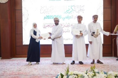 واشتمل الحفل على تكريم (161) طالبًا وطالبة من المجيدين دراسيًا، إلى جانب (34) من المعلمين والمعلمات الذين أسهموا في دعم مسيرة التحصيل العلمي، كما تم تكريم عدد من الداعمين وأعضاء مجلس أولياء الأمور، فضلًا عن تكريم الطاقات التربوية، ومن بينهن معلمات حققن مراكز متقدمة على مستوى سلطنة عُمان.