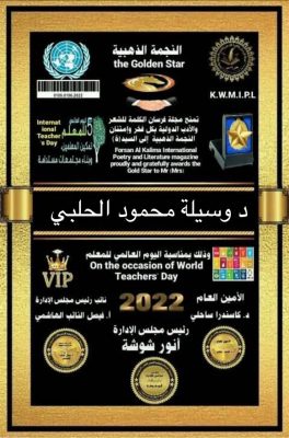 بمناسبة اليوم العالمي للمعلم 2022 منحت مجلة فرسان الكلمة للشعر والادب الدولية بكل فخر وامتنان (النجمة الذهبية) للدكتورة وسيلة محمود الحلبي سفيرة الإعلام العربي والتي عملت في سلك التعليم سنوات عديدة سابقا .