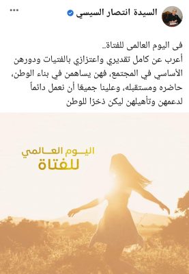 وقالت السيدة انتصار السيسي، عبر الصفحة الرسمية، فى اليوم العالمى للفتاة..أعرب عن كامل تقديري واعتزازي بالفتيات ودورهن الأساسي في المجتمع، فهن يساهمن في بناء الوطن، حاضره ومستقبله، وعلينا جميعًا أن نعمل دائماً لدعمهن وتأهيلهن ليكن ذخرًا للوطن