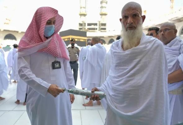 شؤون الحرمين بمكة المكرمة توزع(المظلات الشمسية) على المعتمرين بالمسجد الحرام اليوم