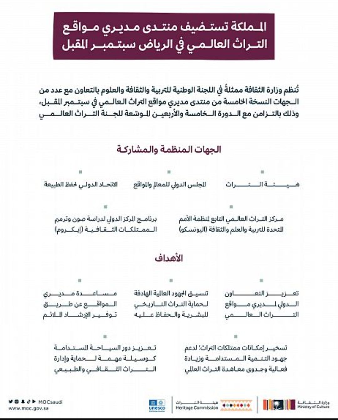تُنظّم وزارة الثقافة في المملكة ممثلةً في اللجنة الوطنية للتربية والثقافة والعلوم، وهيئة التراث، وبالتعاون مع مركز التراث العالمي التابع لمنظمة الأمم المتحدة للتربية والعلم والثقافة (اليونسكو) وبرنامج المركز الدولي لدراسة صون وترميم الممتلكات الثقافية (إيكروم) والاتحاد الدولي لحفظ الطبيعة (IUCN) وبالشراكة مع المجلس العالمي للمعالم والمواقع (ICOMOS)