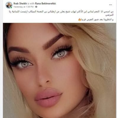 الجدير بالذكر ان المطرب ايهاب شيخ اعلن امس عبر حسابه على موقع التواصل الاجتماعي فيسبوك عن ارتباطه بفنانة الميكب ارتست اللبنانية رنا المرعبي، والتي ستصل للقاهرة في غضون ايام لإتمام عقد القران واقامة حفل الزفاف السعيد.