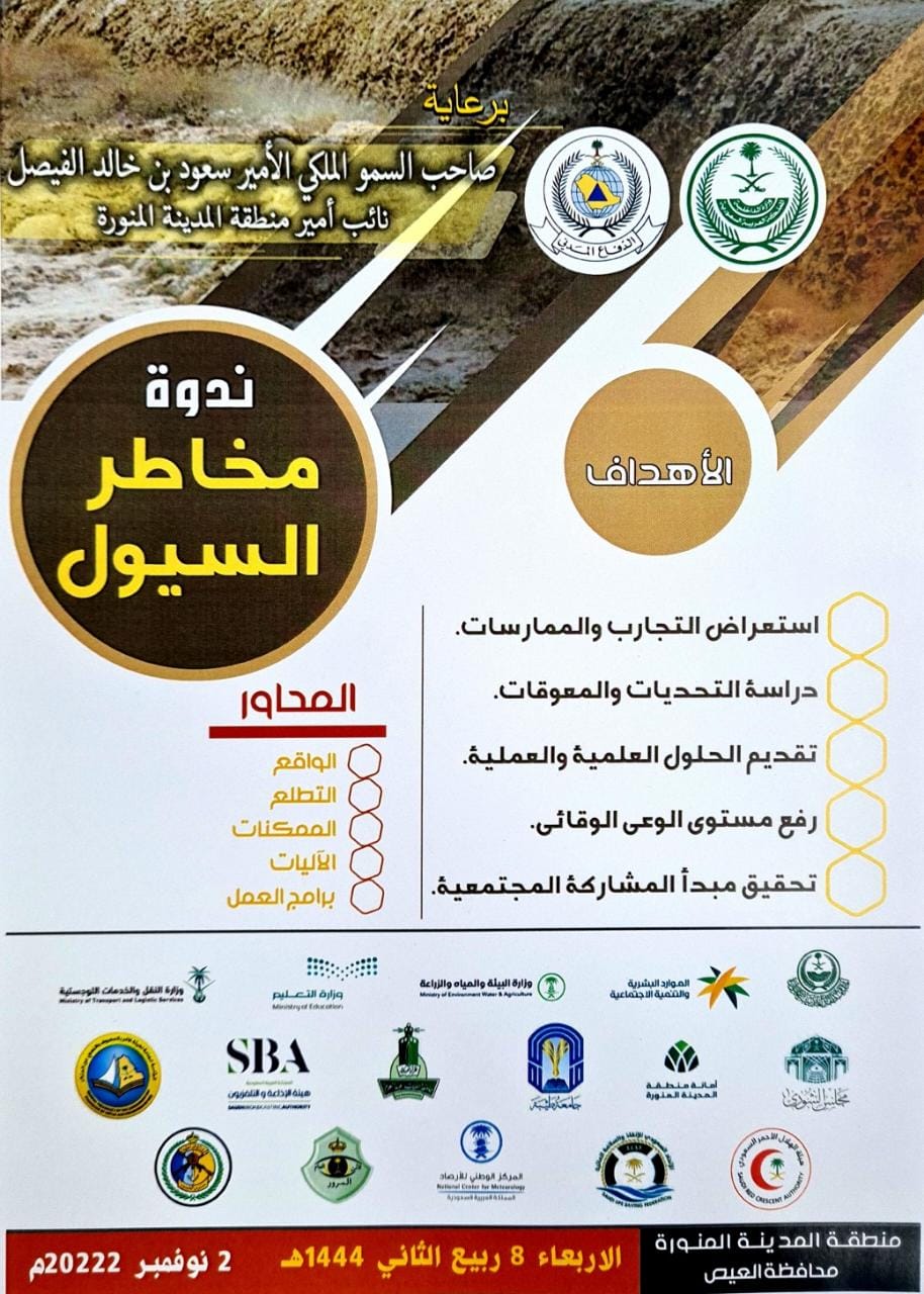 برعاية كريمة من صاحب السمو الملكي الأمير سعود بن خالد الفيصل نائب أمير منطقة المدينة المنورة تنطلق ندوة مخاطر السيول .
