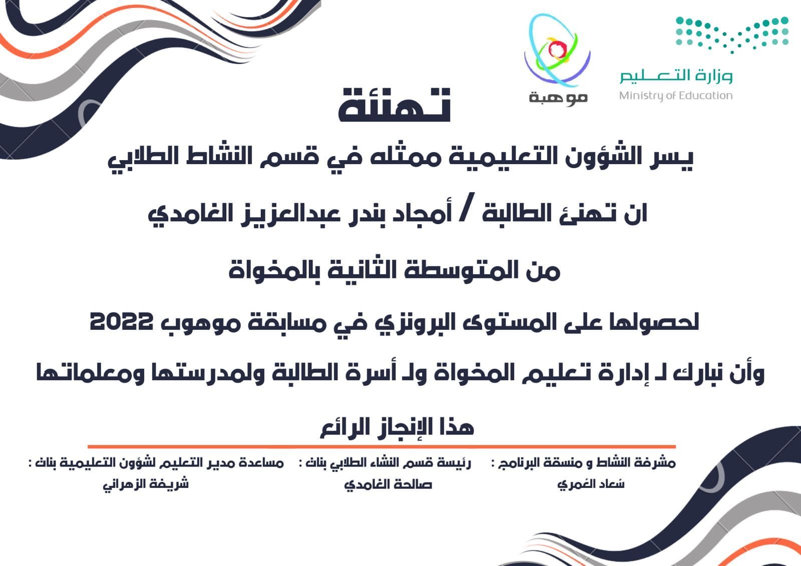 حصلت الطالبة أمجاد بندر عبدالعزيز الغامدي بالمرحلة المتوسطة على المستوى البرونزي على مستوى الوزارة في مسابقة موهوب لعام 2022م ودخولها “برنامج موهبة للاولمبياد الدولية لمدة سنتين تؤهلهم لتمثيل المملكة في 19 أولمبياداً إقليميا ودوليا