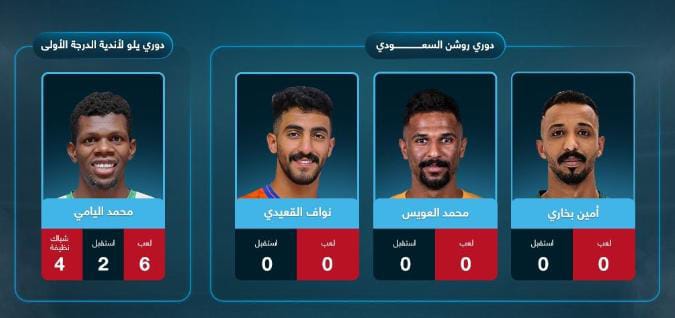 ولم يشارك الثلاثي حارس الهلال محمد العويس وحارسي النصر أمين بخاري ونواف العقيدي في أي مباراة مع أنديتهم هذا الموسم في دوري روشن السعودي للمحترفين.