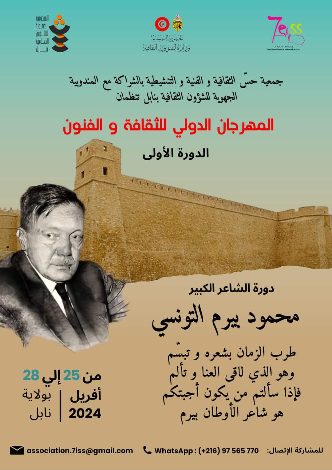 حيث أن مهرجان دولي في دورة خاصة بالشاعر الكبير محمود بيرم التونسي تنظمه جمعية حسّ الثقافية والتنشيطية والفنيّة برئاسة رئيسة الجمعية السيّدة لمياء بالشيخ إبراهيم وإدارة الأستاذ لطفي عبد الواحد بالشراكة مع المندوبية الجهوية للشؤون الثقافية بولاية نابل زهرة المتوسّط من26 إلى 28 أفريل 2024 في واحد من أفخر النزل السياحية في الجهة.