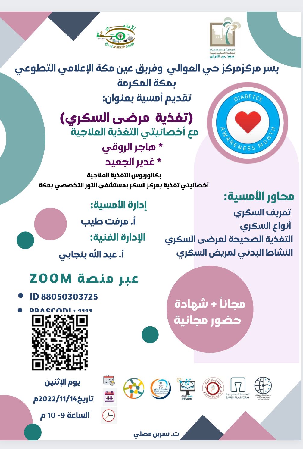 يقدم مركز حي العوالي وفريق عين مكة الاعلامي التطوعي التابعين لجمعية مراكز الاحياء أمسية عن بعد عبر منصة الزووم بعنوان تغذية مرضى السكري بمناسبة اليوم العالمي للسكري من 14-16 نوفمبر المحاور :
