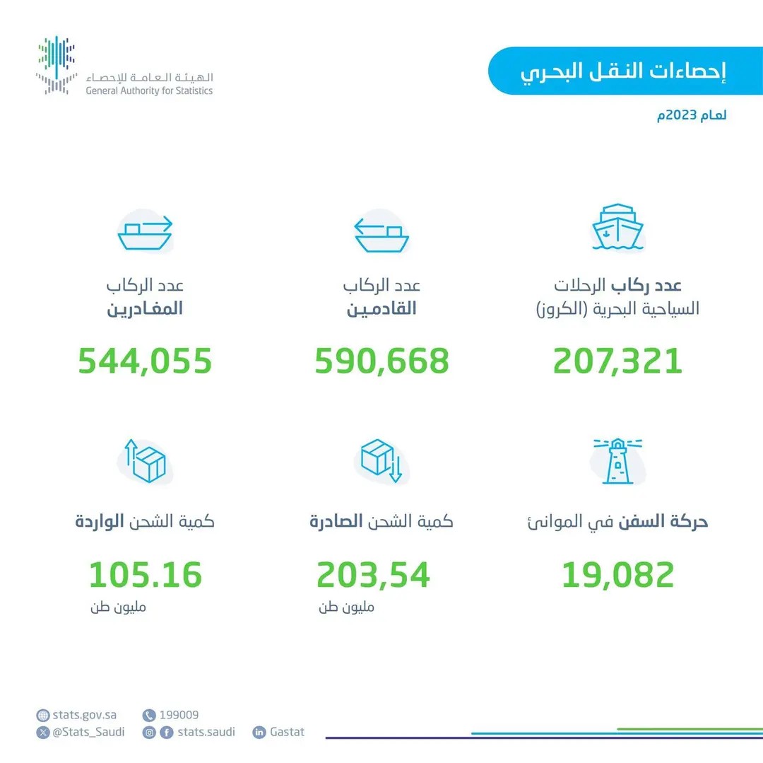 أعلنت الهيئة العامة للإحصاء اليوم نتائج نشرة إحصاءات النقل البحري في المملكة العربية السعودية لعام 2023م،