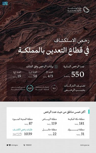 كشفت وزارة الصناعة والثروة المعدنية أن عدد تراخيص الاستكشاف السارية في قطاع التعدين قد بلغ 550 رخصة موزعة على 11 منطقة إدارية حول المملكة، تتصدرها رخص معادن الفئة (أ) بـ 473 رخصة، ثم الفئة (ب) بنحو 58 رخصة، وأخيراً الفئة (ج) بـ 19 رخصة.