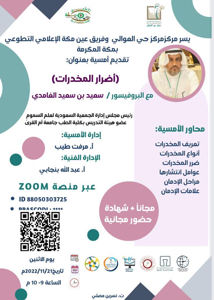 يقدم مركز حي العوالي وفريق عين مكة الاعلامي التابعين لجمعية مراكز الاحياء بمكة المكرمة أمسية عن بعد بعنوان أضرار المخدرات