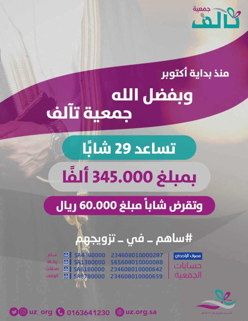 قدمت الجمعية الخيرية لتيسير الزواج والرعاية الأسرية “تآلف” بمحافظة عنيزة، دعمًا ماليًا لـ 29 شابًا من المقبلين على الزواج، حيث بلغ مجموع المبالغ المقدمة منذ بداية شهر أكتوبر لهذا العام 345 ألف ريال، كما أقرضت الجمعية شابًا مبلغ 60 ألف ريال، وذلك بهدف مساعدتهم والوقوف معهم في مقتبل حياتهم.