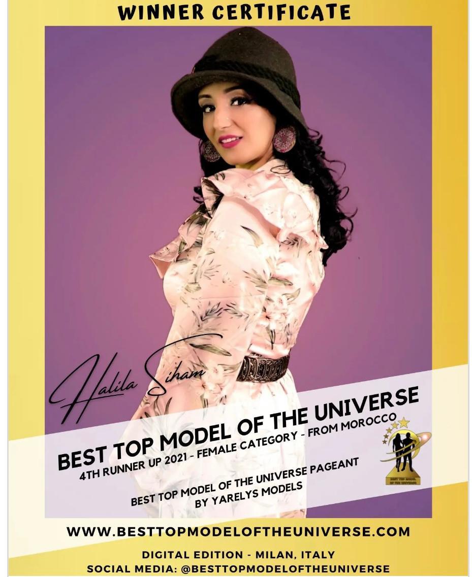 فازت المغربية عارضة الازياء والفنانة سهام حليلة بلقب احسن عارضة ازياء بالعالم خلال تنافسها بمسابقة احسن عارضة ازياء بالعالم لسنة 2022بإيطاليا والمنظمة من طرف احدى اشهر شركات الازياء بميلانو تحمل اسم Best Top Model Of Universe .