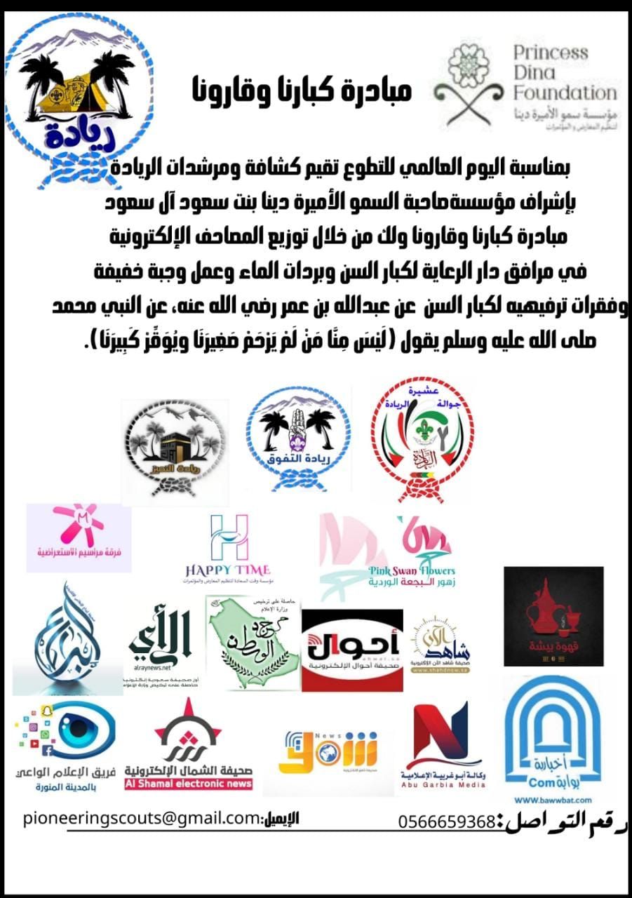 بمناسبة اليوم العالمي للتطوع كشافة ومرشدات الريادة التابعة لصاحبة السمو الملكي الأميرة دينا بنت سعود بن عبدالعزيز آل سعود واشراف من إدارة مؤسسة الأميرة دينا ومشاركة عدد من الجهات والصحف اقيمت مبادرة كبارنا وقارنا ، والتي تهدف لتعزيز القيم والواجبات تجاه آبائنا ومن هم اكبر منا ، فعن عبدالله بن عمر رضي الله عنه قال قال رسول الله صل الله عليه وسلم ( ليس منا من لم يرحم صغيرنا ويوقر كبيرنا )، وكان لإدارة دار الرعاية الصحية لكبار السن الدور الفعال في اتمام المبادرة و خلال المبادرة تك توزيع اجهزة القرآن الكريم والرقية الشرعيه لجميع اقسام الدار وبرادة الماء .