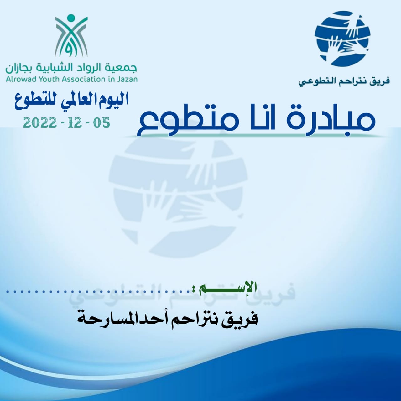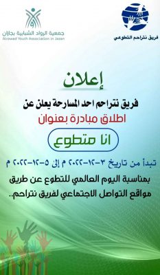 اختتم فريق نتراحم التطوعي بمحافظة أحد المسارحة مبادرته التي أطلقها يوم السبت الماضي لمدة ٣ أيام بمناسبة اليوم السعودي و العالمي للتطوع تحت عنوان ” أنا متطوع ” والتي تهدف إلى التعريف بالعمل التطوعي ونشر ثقافة التطوع بين أعضاء الفريق.