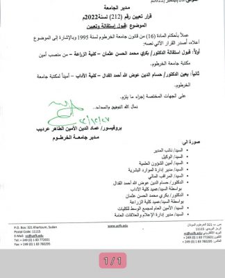 أصدر البروفيسور عماد الدين الامين الطاهر عرديب قرارا قضى بتعيين الدكتور حسام الدين عوض الله القدال امين لمكتبة جامعة الخرطوم
