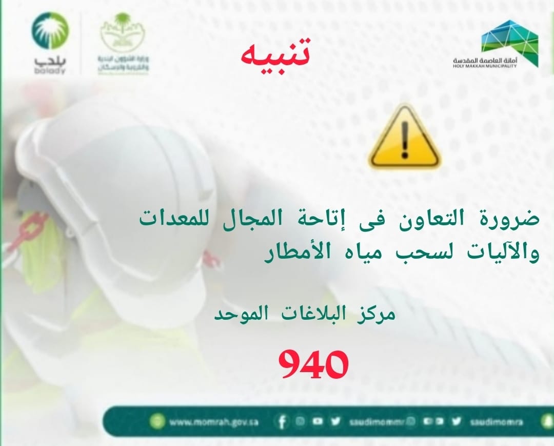 ، من خلال نشر فِرق العمل والمُعِدَّات الموزعة بكافَّة أنحاء العاصمة المقدسة حيث تم تجهيز 52 صهريجاً لشفط مياه السيول (بسعة 194 ألف جالون)، و146 غرافاً، و89 شاحنةً متنوعة الاستخدامات؛ للتعامل مع آثار الأمطار المتوقعة وإزالة تجمُّعات المياه من الطرق والشوارع بالعاصمة المقدسة ، مشيرة الى ضرورة التعاون والالتزام بالتعليمات التي تصدر عن المركز الوطني للأرصاد وتعليمات الجهات المعنية بإتباع الاتي :