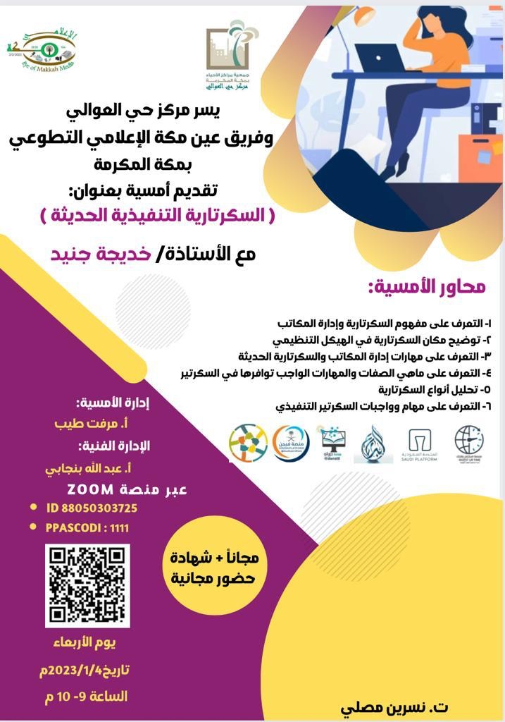 طتقدم اللجنة النسائية لمركز حي العوالي وفريق عين مكة الاعلامي التطوعي التابعين لجمعية مراكز الاحياء بمكة المكرمة أمسية عن بعد بعنوان السكرتارية التنفيذية الحديثة