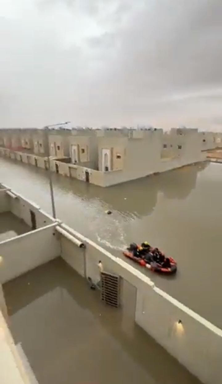 تداولت مواقع التواصل الاجتماعي خلال الساعات الماضية مقطع فيديو يُظهر تضرر مشروع سكني حديث شرقي الرياض جراء الأمطار التي شهدتها العاصمة أخيراً، إذ حاصرته مياه الأمطار وتحول لبركة ما يكشف غياب مشاريع الصرف داخل المشروع، كما أظهر المقطع تجول قوارب الدفاع المدني داخل الحي لإخراج السكان.