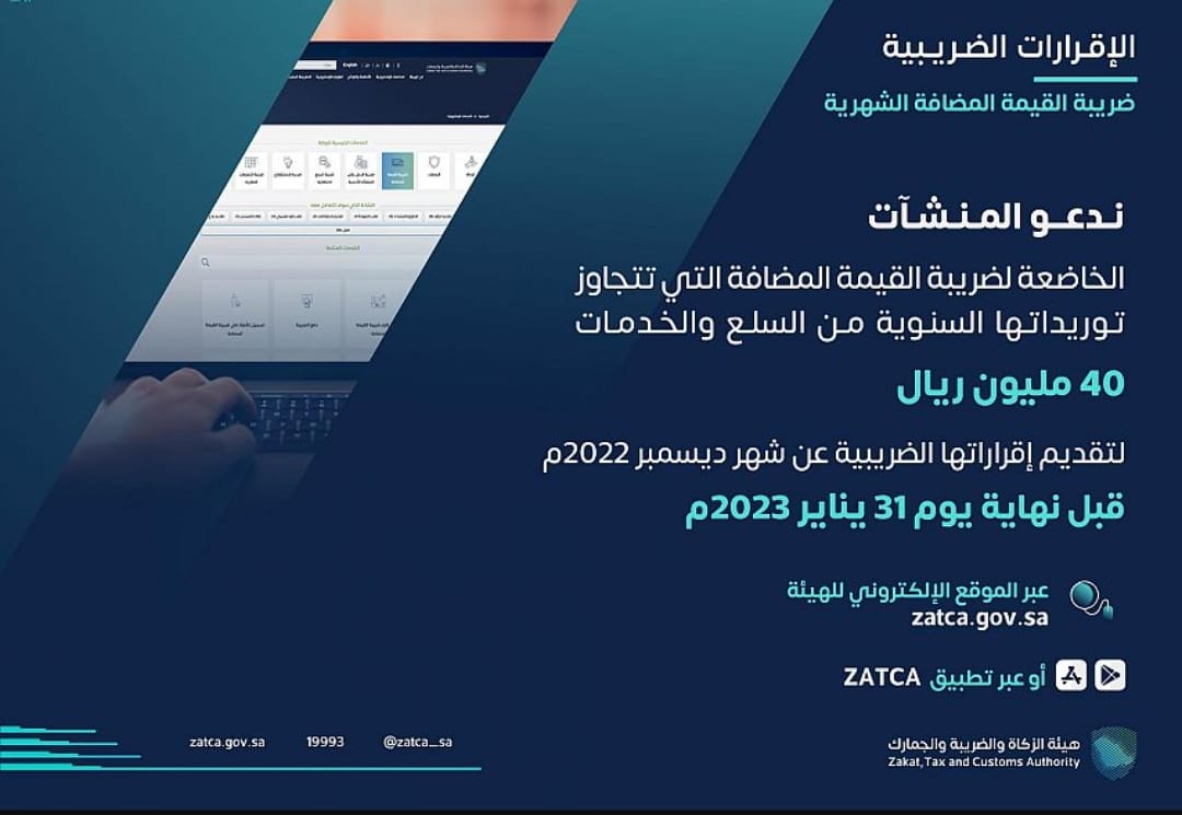 دعت هيئة الزكاة والضريبة والجمارك المنشآت من قطاع الأعمال الخاضعين لضريبة القيمة المضافة التي تتجاوز توريداتها السنوية من السلع والخدمات 40 مليون ريال إلى تقديم إقراراتهم الضريبية عن شهر ديسمبر الماضي والربع الرابع من عام 2022م، وذلك في موعدٍ أقصاه 31 من شهر يناير الجاري.