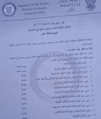 اصدر وكيل وزارة الصناعة المكلف م. بتول عباس عوض علام قرارا اداريا حمل الرقم (4) لسنة 2023 قضى بتشكيل لجنة عليا برئاستها وعضوية آخرين للإشراف على قيام معرض صنع في السودان في دورته الثالثة عشر بأرض المعارض ببري