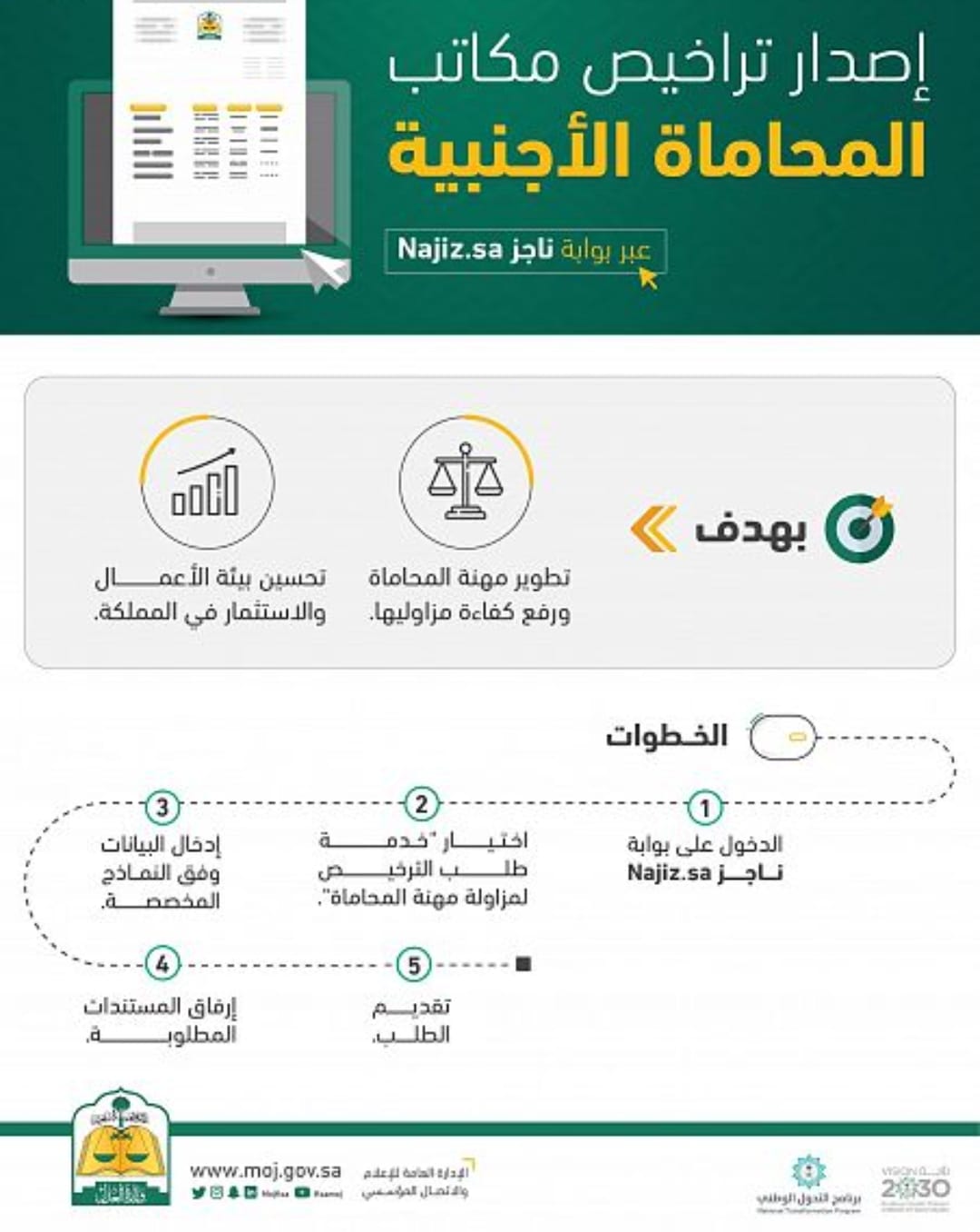 أعلنت وزارة العدل عن إتاحة خدمة تقديم طلب الحصول على ترخيص بمزاولة مهنة المحاماة لمكاتب المحاماة الأجنبية عبر بوابة الخدمات العدلية الإلكترونية “ناجز”، بهدف رفع وتطوير مهنة المحاماة، ورفع كفاءة مزاوليها، وتحسين بيئة الأعمال والاستثمار في المملكة.