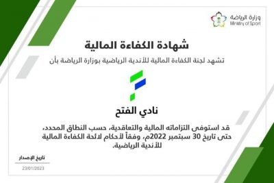 وجاء حصول الفتح على الشهادة بعد الوفاء بالتزاماته التعاقديه والمالية حسب النطاق المحدد من قبل اللجنة حتى تاريخ 30 سبتمبر 2022م.