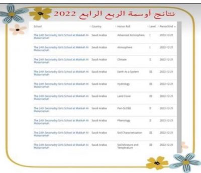 أعلنت الإدارة العامة للتعليم بمنطقة مكة المكرمة ممثلة في إدارة نشاط الطالبات يوم السبت الموافق 6 / 7 / 1444هـ حصول مدارس جلوب البيئي على أوسمة الشرف في الربع الرابع للعام 2022 م ، والبالغ عددها 13 وسام شرف وذلك من قبل وكالة ناسا الفضائية