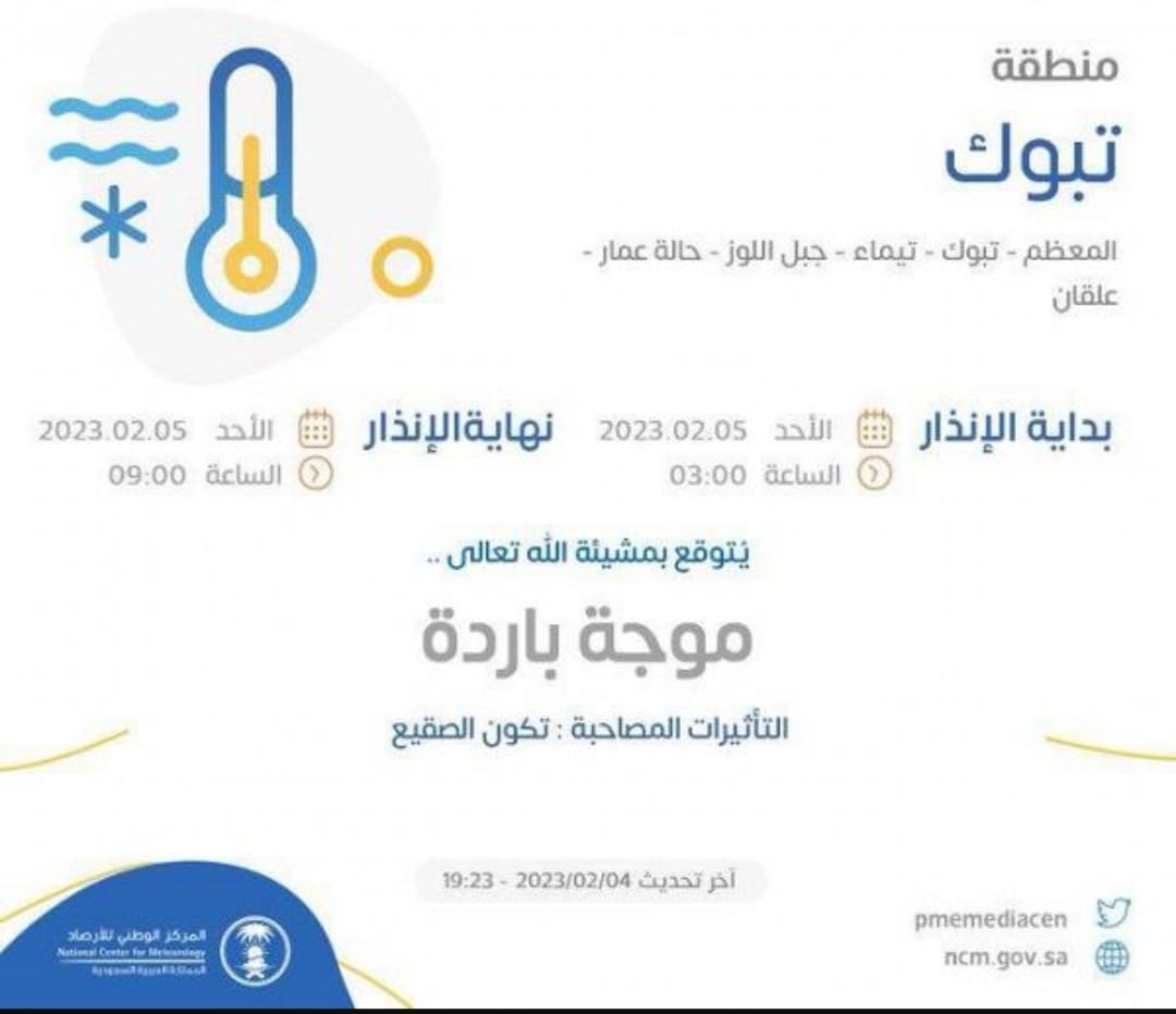 نبّه المركز الوطني للأرصاد اليوم من موجة باردة على منطقة تبوك، تشمل تأثيراتها تكون للصقيع على تبوك ومحافظة تيماء ومراكز المعظم وجبل اللوز وحالة عمار وعلقان.
