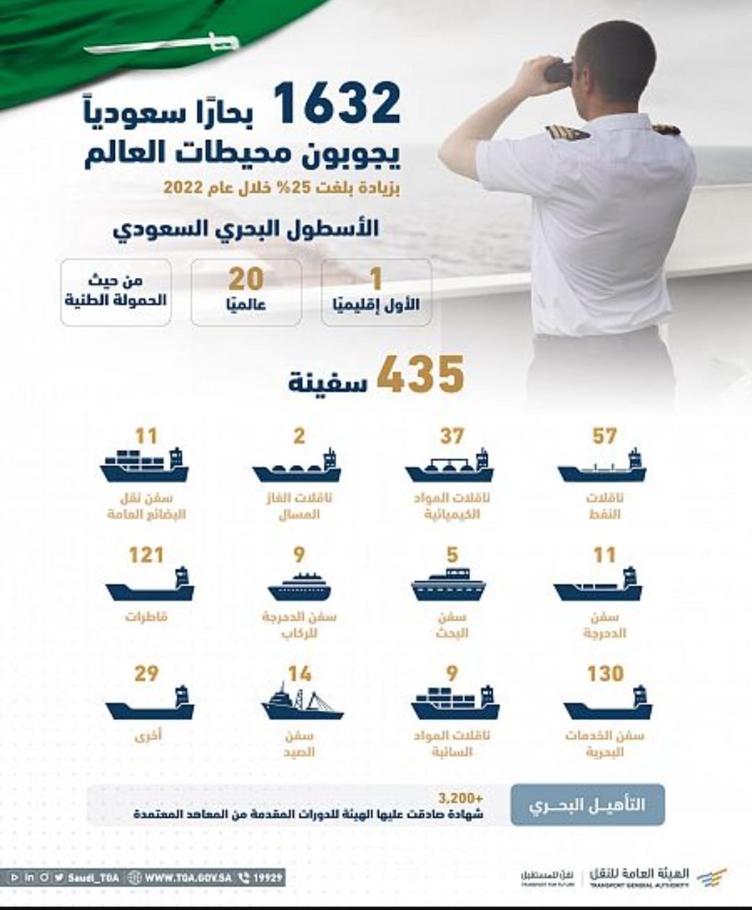 الهيئة العامة للنقل : (1,632) بحارًا سعوديًا في 2022م وبنسبة نمو بلغت (52%) مقارنةً بالعام 2021