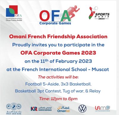 تنظم جمعية الصداقة العمانية الفرنسية بمسقط يوم السبت ١١ فبراير ٢٠٢٣م النسخة الأولى من بطولة ألعاب (OFA) للشركات والمؤسسات والأفراد أعضاء الجمعية بالسلطنة ،