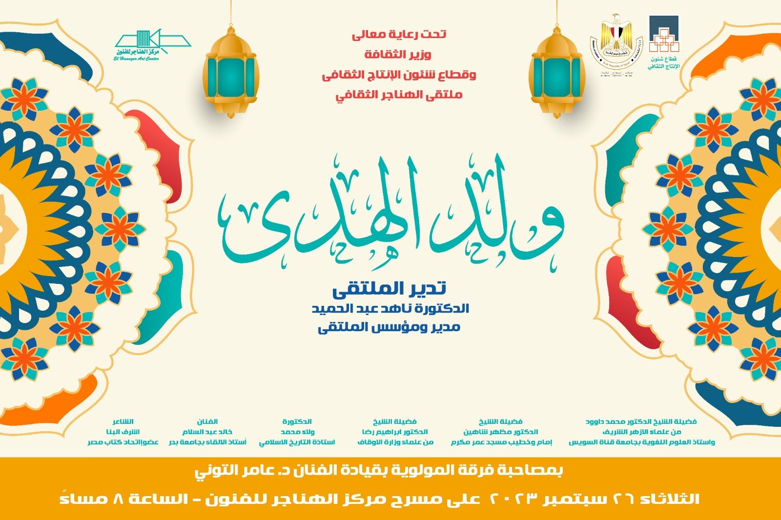احتفالا بالمولد النبوى الشريف، يقيم قطاع شئون الإنتاج الثقافى برئاسة المخرج خالد جلال، ملتقى الهناجر الثقافي، تحت عنوان “ولد الهدى” فى الثامنة من مساء غد الثلاثاء، بمركز الهناجر للفنون برئاسة الفنان شادى سرور.