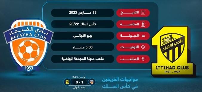 يستقبل الفريق الأول لكرة القدم بنادي الفيحاء اليوم الاثنين نظيره الاتحاد, في مباراة لحساب الدور ربع النهائي من كأس الملك 22/23 .