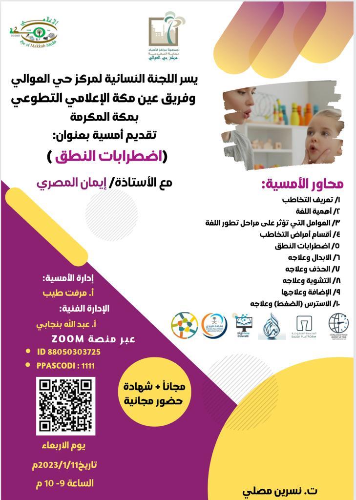 تقدم اللجنة النسائية لمركز لمركز حي العوالي وفريق عين مكة الاعلامي التطوعي التابعين لجمعية مراكز الاحياء بمكة المكرمة امسية عن بعد بعنوان اضطرابات النطق مع الأستاذة إيمان المصري .