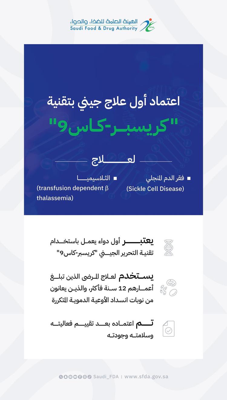 اعتمدت الهيئة العامة للغذاء والدواء علاج كاسجفي (Casgevy)، الذي يعد أول علاج يعمل باستخدام تقنية التحرير الجيني “كريسبر-كاس9” لعلاج مرض فقر الدم المنجلي ومرض الثلاسيميا للمرضى البالغ أعمارهم 12 سنة فأكثر.