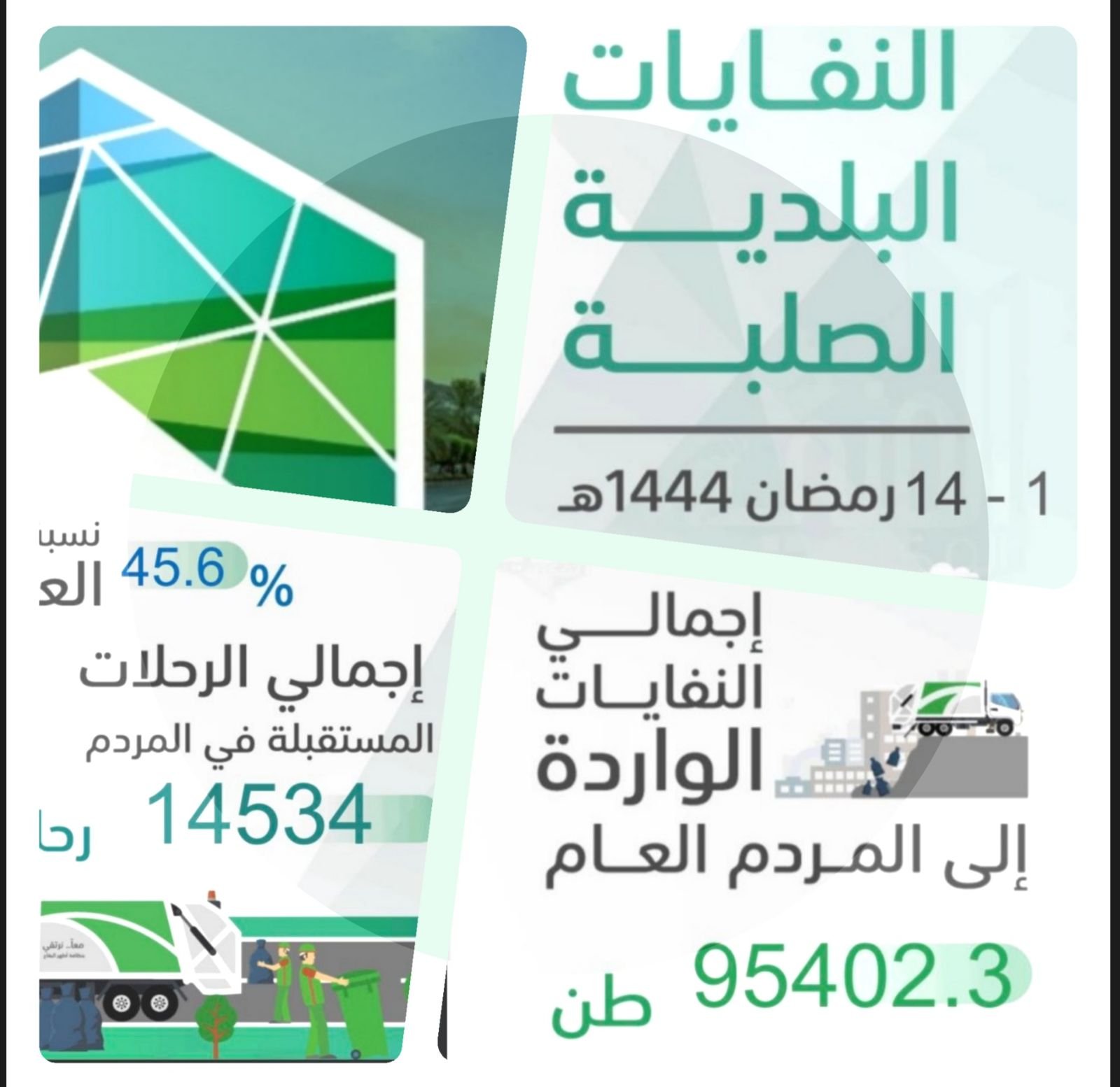 بلغ إجمالي نفايات البلدية الصلبة منذ بدء شهر رمضان المبارك التي قامت أمانة العاصمة المقدّسة، ممثلة بالإدارة العامة للنظافة بوكالة الخدمات، بحصرها ونقلها للمردم العام، 95402.3 طن ونسبة النفايات العضوية 45.6% بمعدل 14535 رحلة نقل للمردم العام.