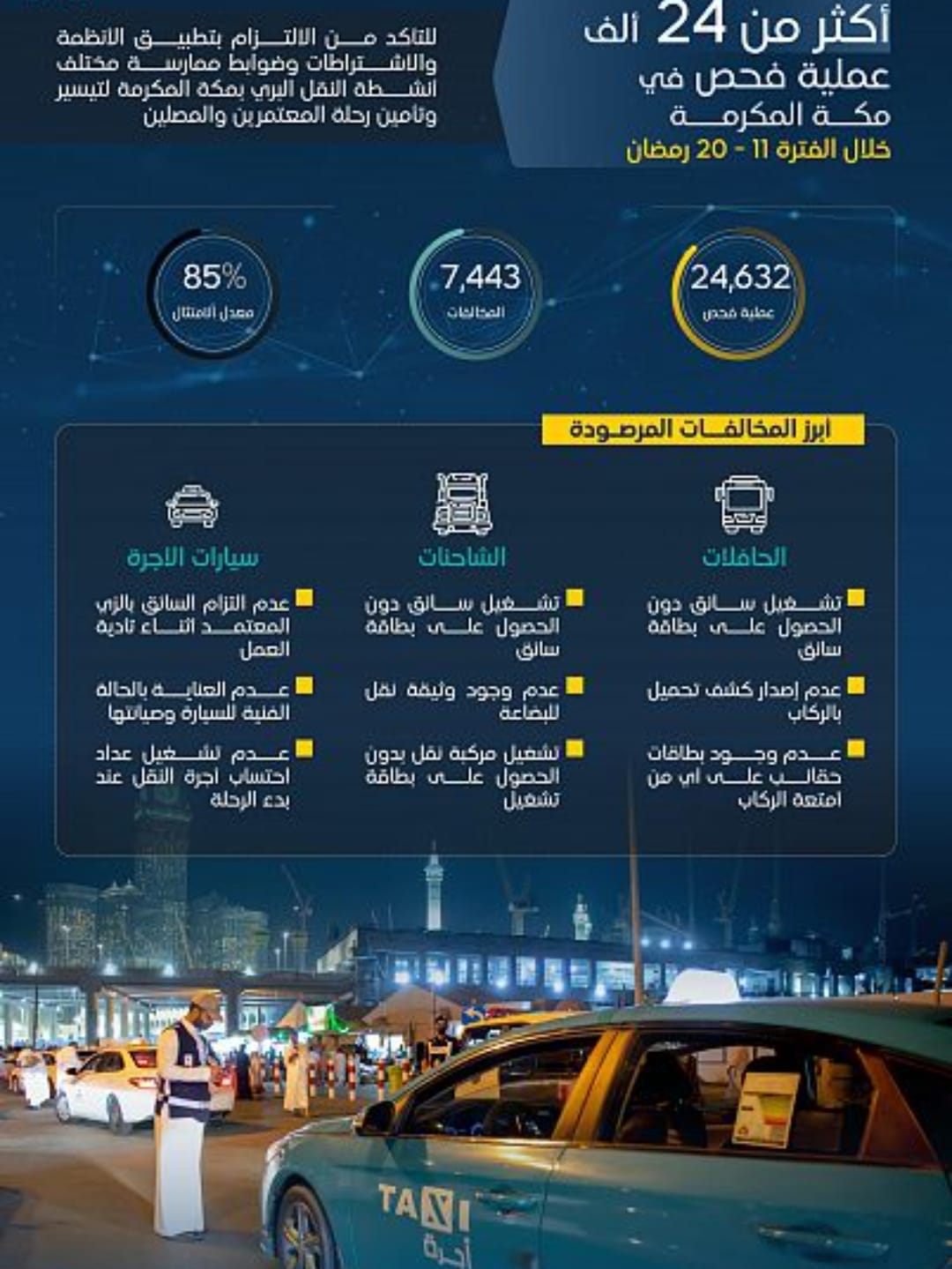 أجرت الهيئة العامة للنقل أكثر من 35 ألف عملية فحص ميدانية في نصف شهر رمضان المبارك في المدينة المنورة ومكة المكرمة؛ وذلك بهدف التأكد من الالتزام بتطبيق الأنظمة والاشتراطات وضوابط ممارسة مختلف أنشطة النقل البري، وتيسير وتأمين رحلات المعتمرين وضيوف الرحمن.