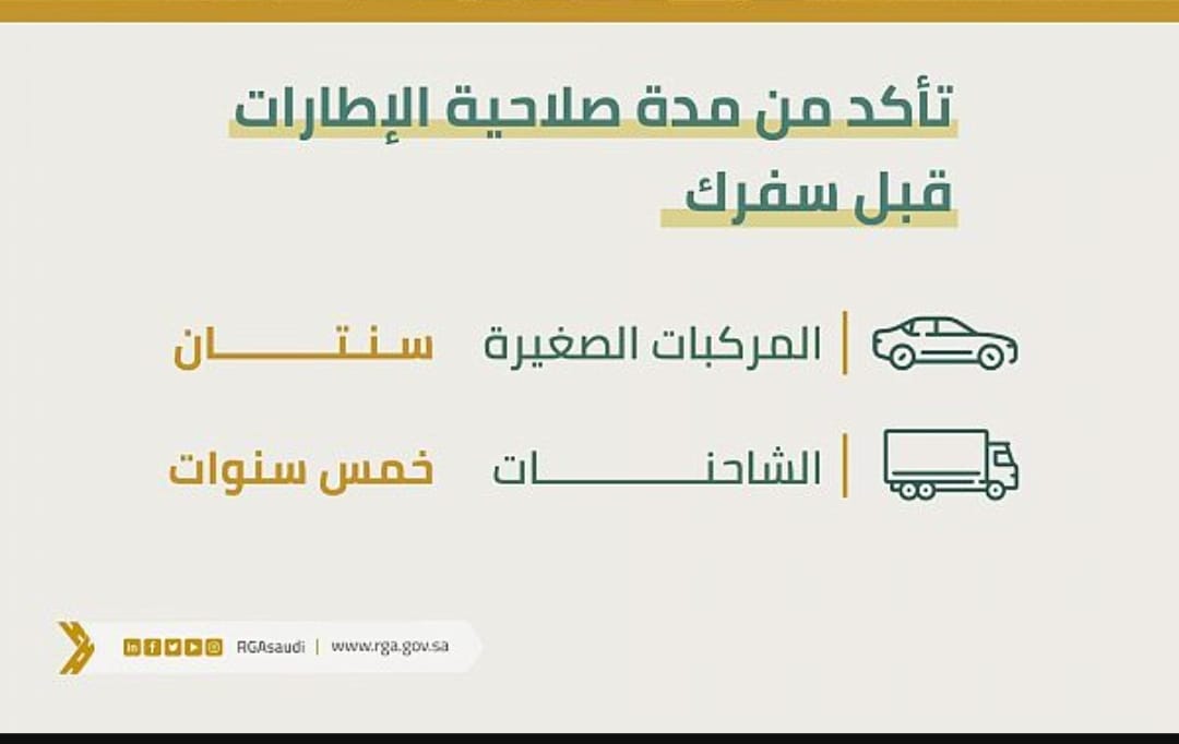 أوصت الهيئة العامة للطرق بأهمية التأكد من صلاحية الإطارات قبل السفر، مؤكدةً أن مدة صلاحية إطارات السيارات الصغيرة تبلغ سنتان، فيما تبلغ مدة صلاحية إطارات الشاحنات خمس سنوات.